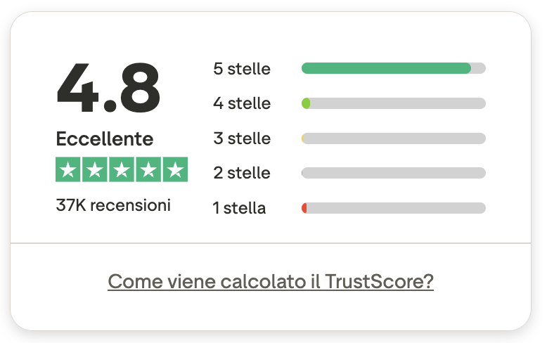 Oltre 37.000 recensioni su Trustpilot con una valutazione media di 4,8/5 confermano l’affidabilità del sistema e dei partner con cui operiamo.